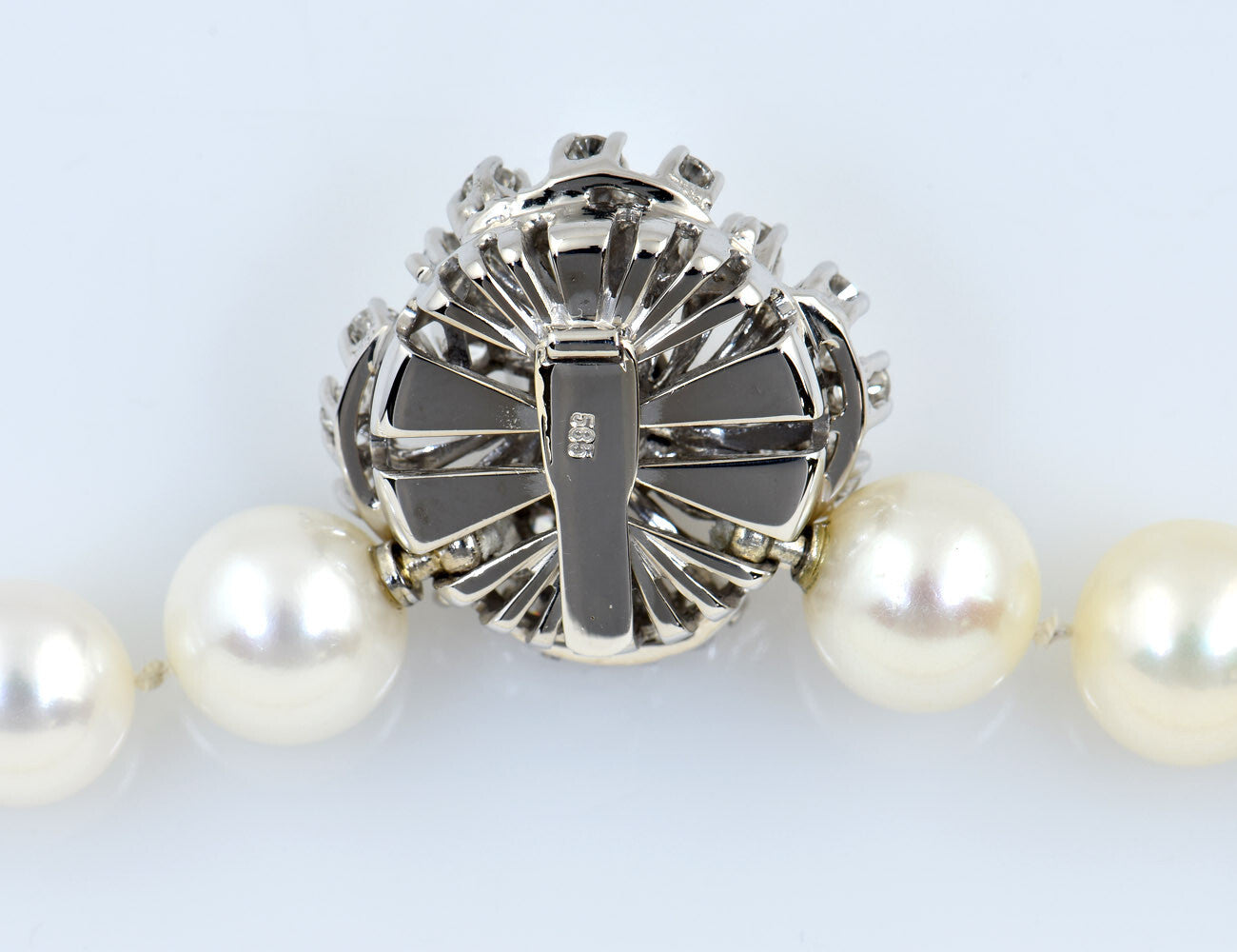 Akoyaperlenkette 750/000 18 K Weißgoldschließe Saphir, 20 Brillanten zus. 0,80ct